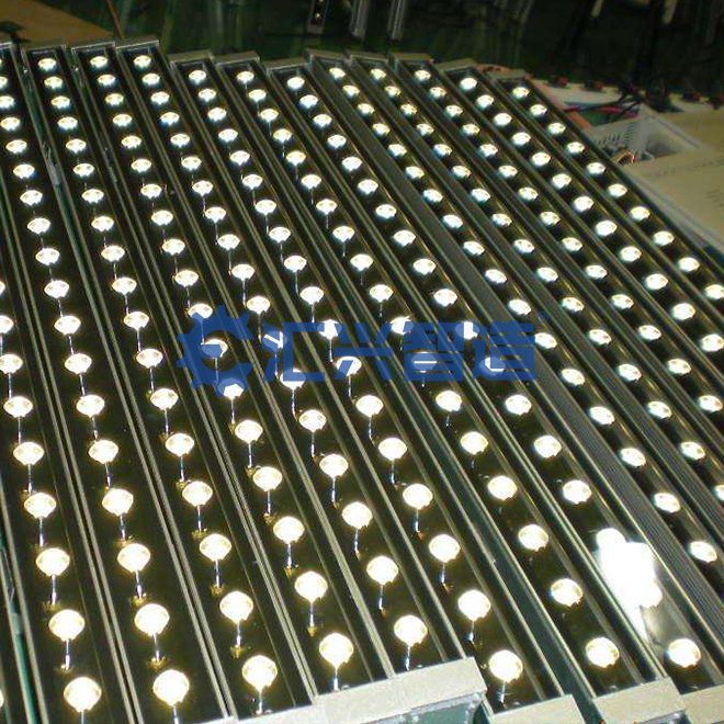 整燈裝配線主要是由輸送帶上料組裝和裝配機完成剪線、彎線、上鋁鉚釘、功率檢測、壓針、點膠、扣泡殼等工序,全線只需操作工人2名,半成品上料1名,可替代手工組裝6人的同等產能,工藝品質穩定。整線造價經濟適用占地空間小,針對小批量的產品可選擇性使用部分自動化功能,整線留有自動化端口后續可升級如自動連接老化線。