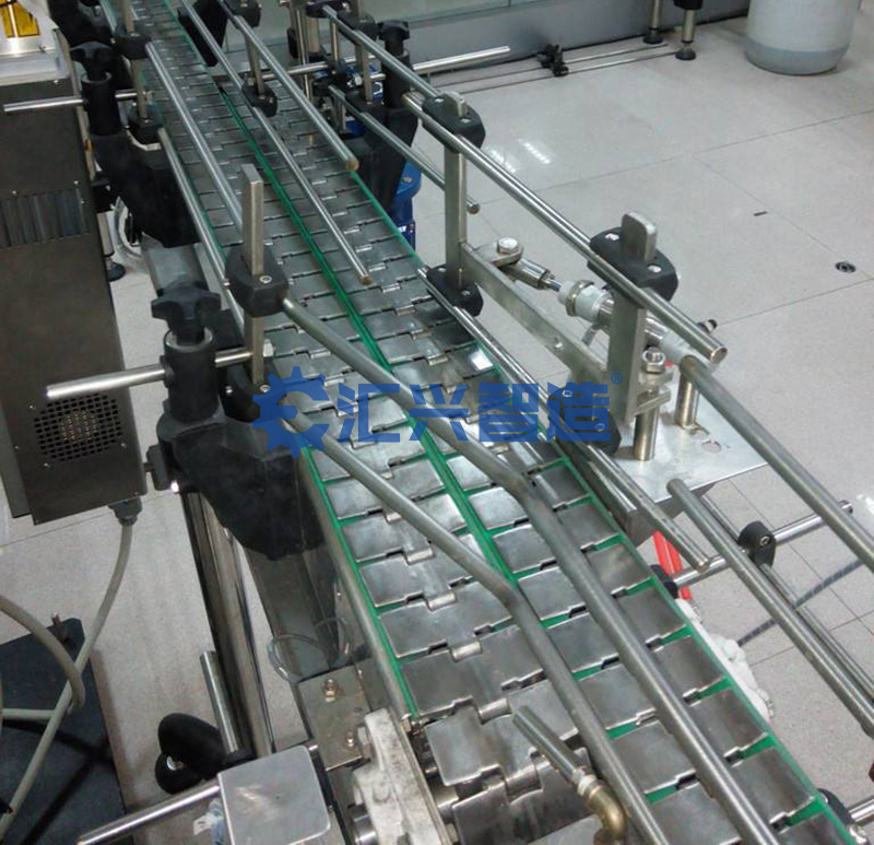 鏈板輸送線以標準鏈板為承載面,由馬達減速機為動力傳動;我們可以通過多列鏈板并行,使鏈板輸送線做的很寬并形成差速,利用多列鏈板的速度差使多列輸送在無擠壓的情況下變?yōu)閱瘟休斔停瑥亩鴿M足飲料貼標、灌裝、清洗等設(shè)備的單列輸送的要求,同樣也可以使單列變成多列并行走緩慢,從而產(chǎn)生儲存量,滿足殺菌機、儲瓶臺、冷瓶機的大量供料的要求,我們可以將兩條鏈板輸送線的頭尾部做成重疊式的混合鏈使得瓶(罐)體處于動態(tài)過度狀態(tài),使輸送線上不滯留物料,可以滿足空瓶以及實瓶壓力和無壓力輸送。